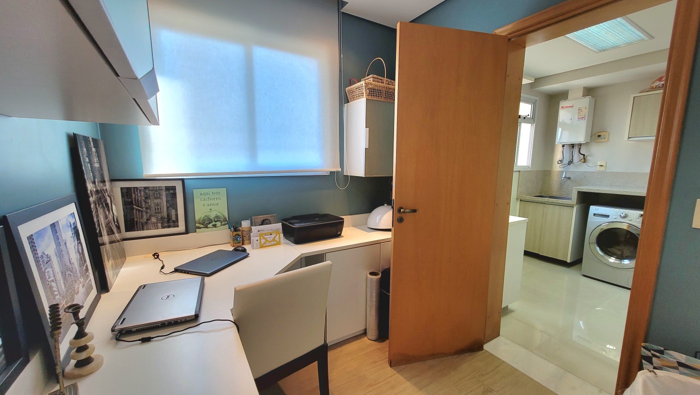 Possui fechadura eletrônica em ambas as portas de serviço e entrada principal, sacada envidraçada, home office todo planejado.