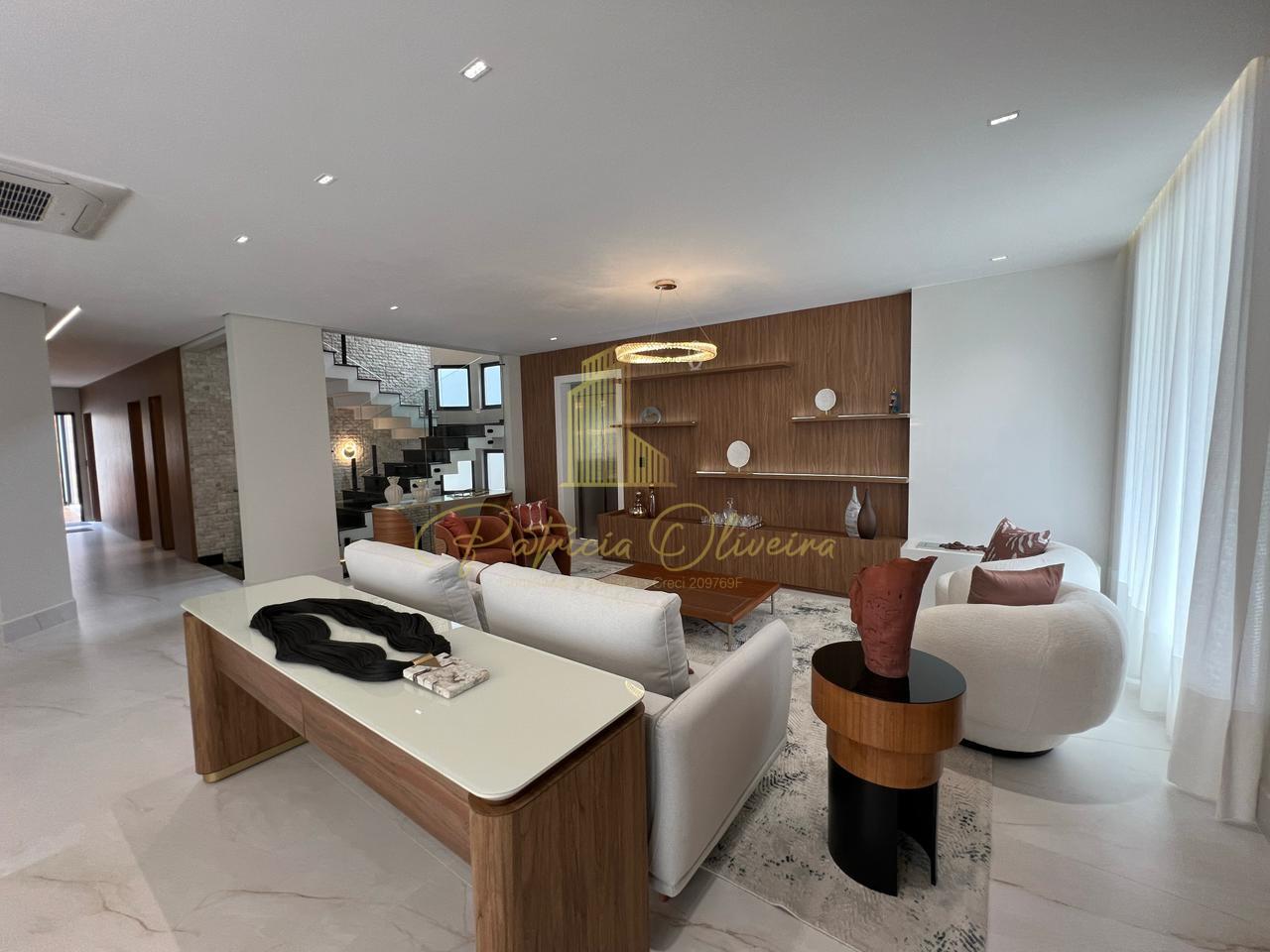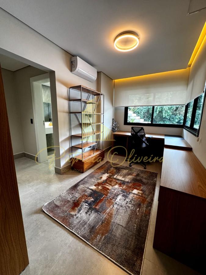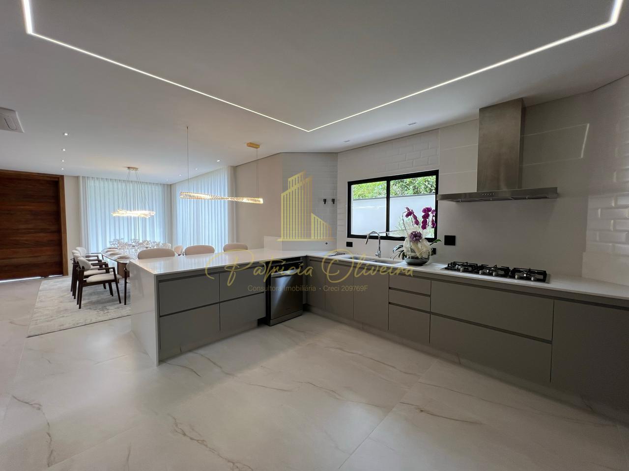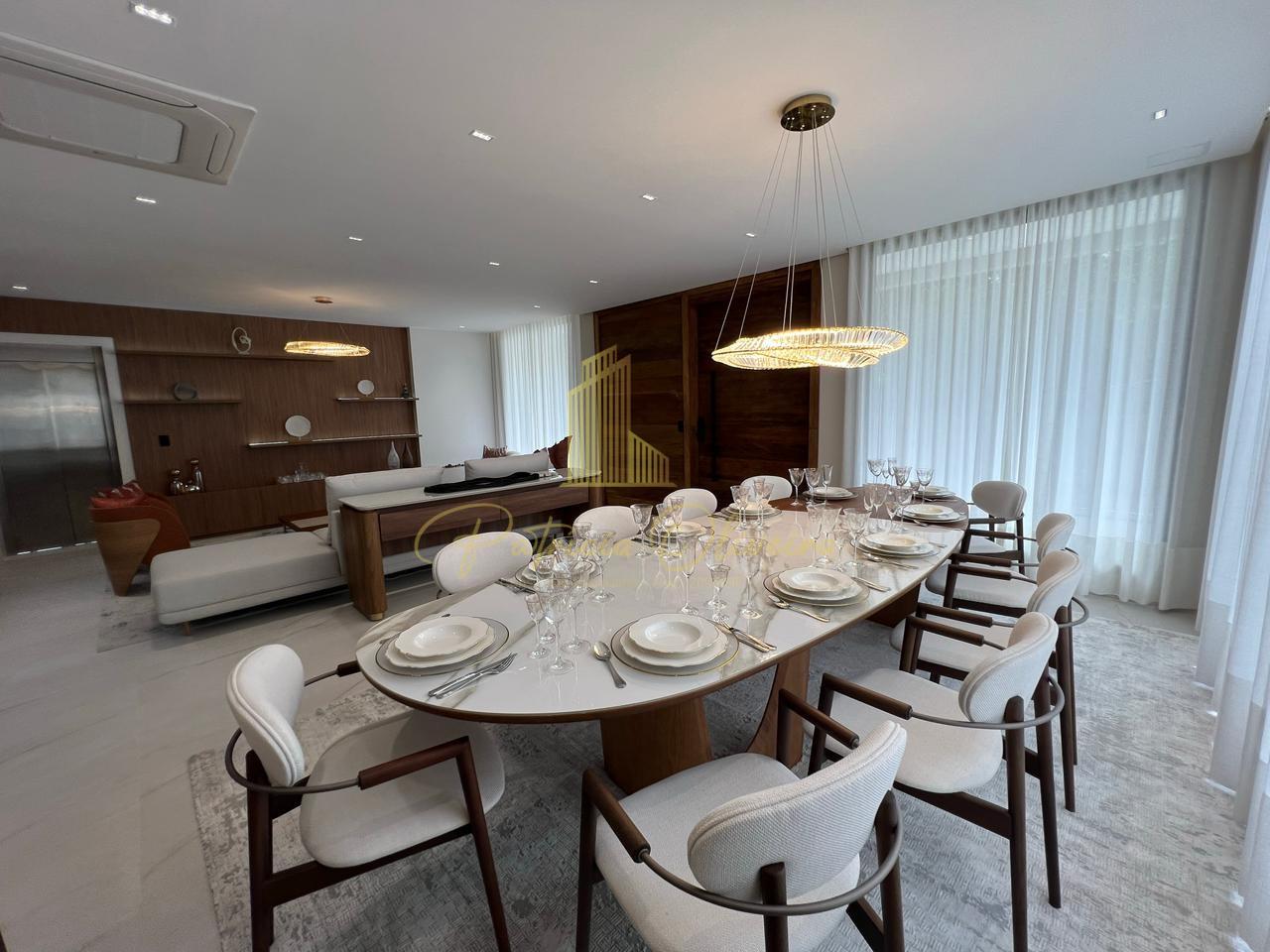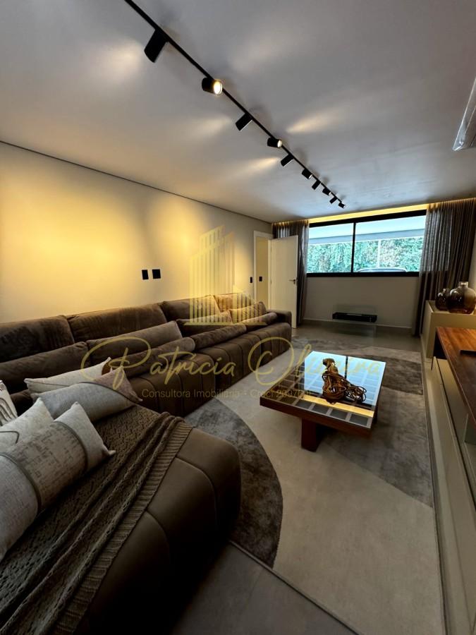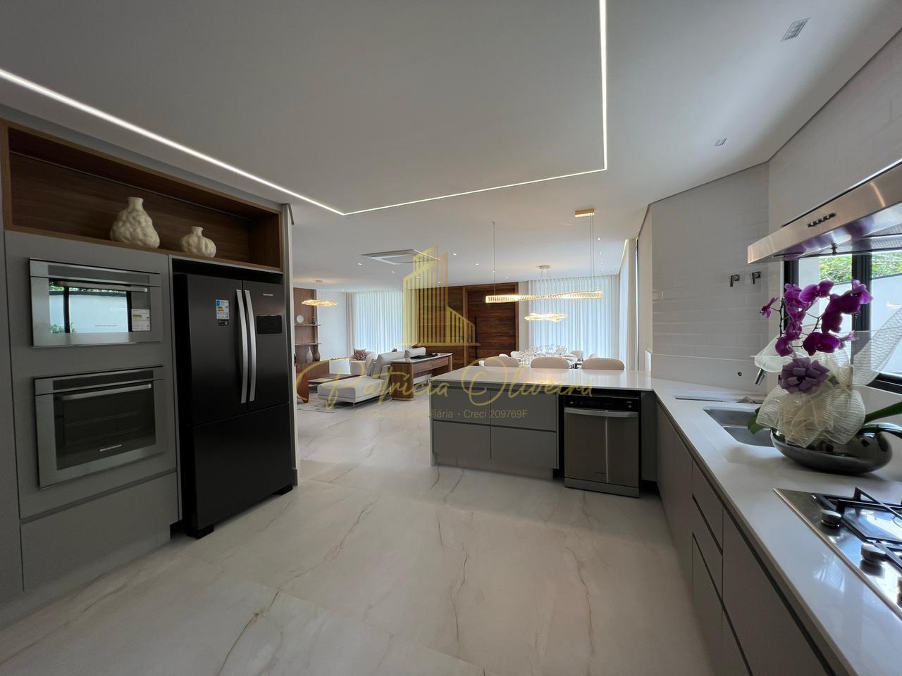 O living integrado à cozinha, sala de cinema (TV 82), escritório privativa, adega climatizada, além do espaço gourmet conectado à piscina aquecida.